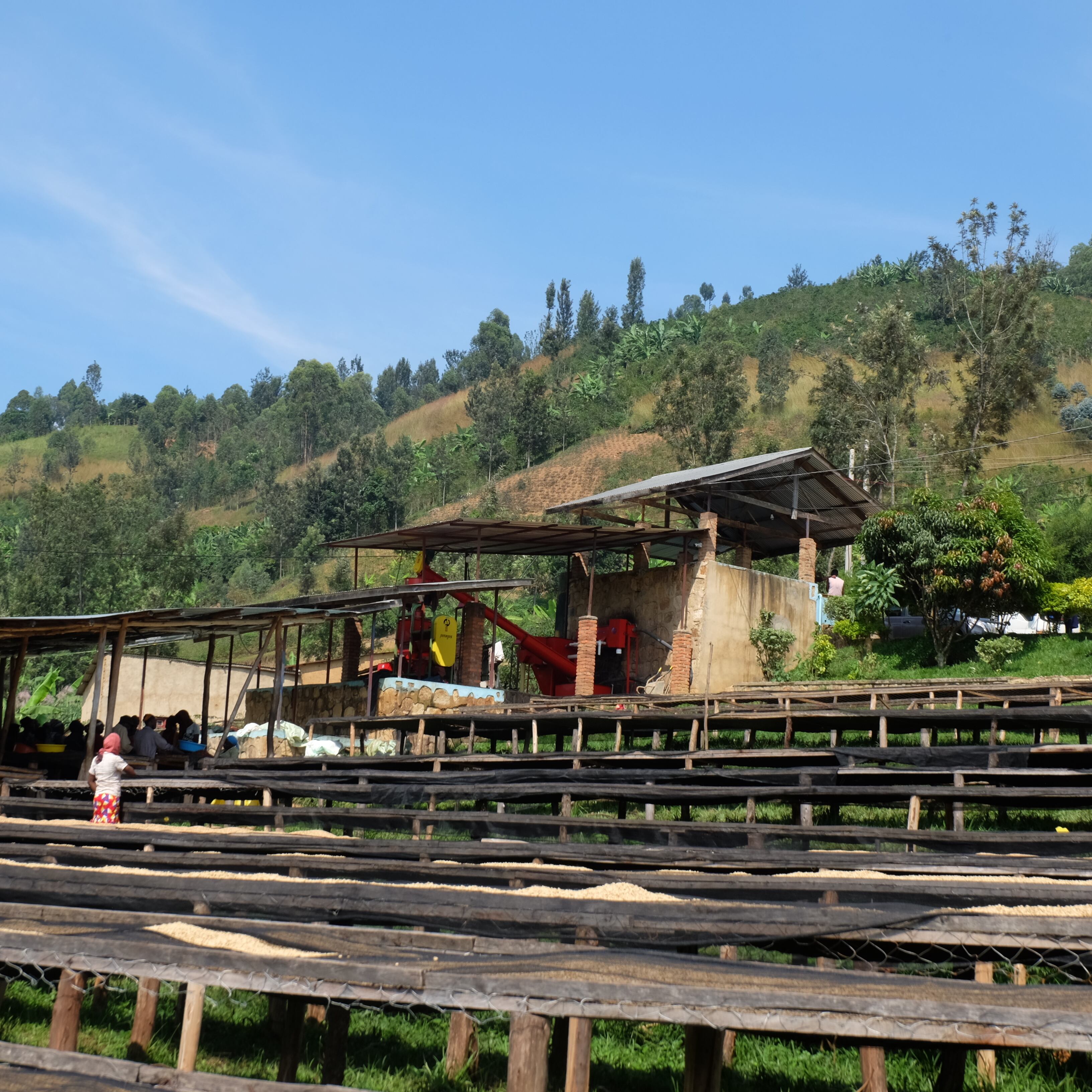 この形は、ルワンダで親しまれるチャパティに卵や野菜を包んだストリートフード「ロレックス」に似ていることから命名されました。こうして巻かれたチェリーは、太陽光の下で72時間発酵させられます。発酵後のコーヒーはシェードネットを敷いた乾燥棚に広げられ、天候に応じて35〜45日間かけてゆっくりと乾燥されます。この期間中は30分ごとに攪拌を行い、均一な乾燥とカビの発生防止が徹底されています。